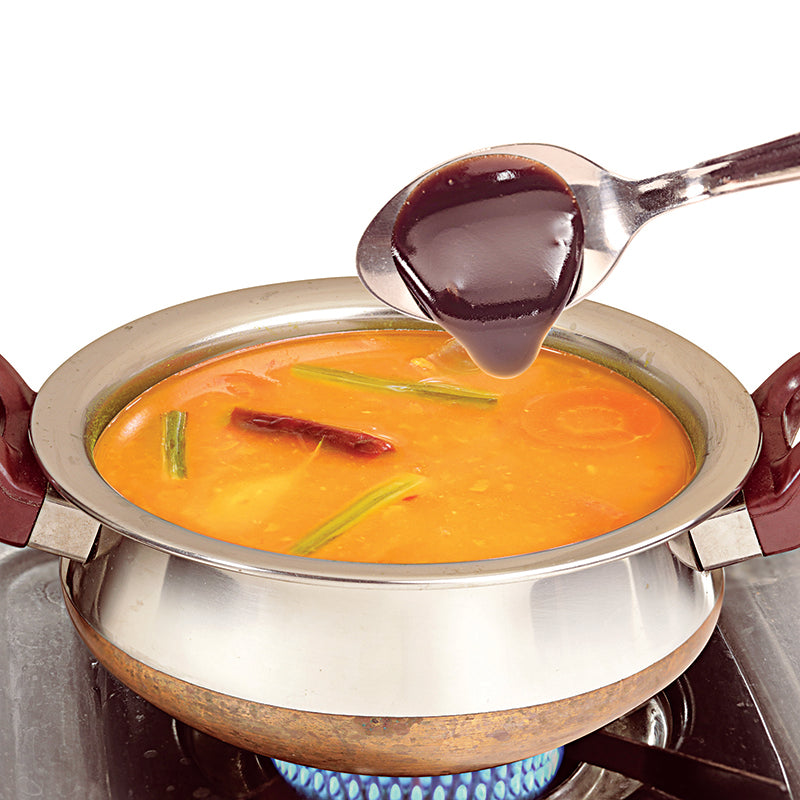Tamarind concentrate is a thick paste made from ripe tamarind pulp. It delivers a balanced sour-sweet flavor and is used as a convenient alternative to fresh tamarind.